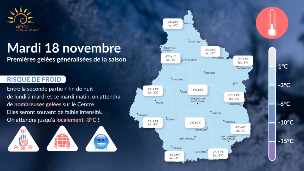 Carte risque froid du 18 novembre 2025 (copyright : Association Météo Centre - Val de Loire). Cliquer sur l'image pour l'agrandir.