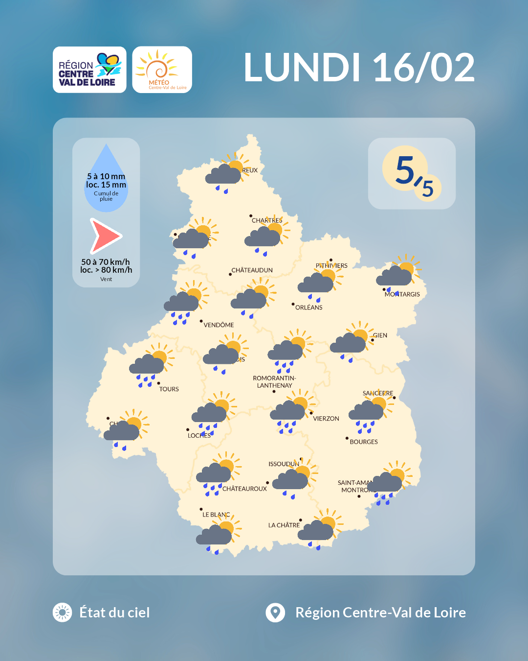 Vers une semaine du 16 au 22 février 2026 encore perturbée avec le passage de plusieurs perturbations, ce qui aura pour effet d'occasionner de nouvelles montées des eaux (Loire, Cher, Indre, Vienne) et de fortes accumulations d'eau par endroits. Le temps pourrait changer à partir de la fin de semaine avec l'installation possible d'un anticyclone et la mise en place d'un temps plus sec et ensoleillé !