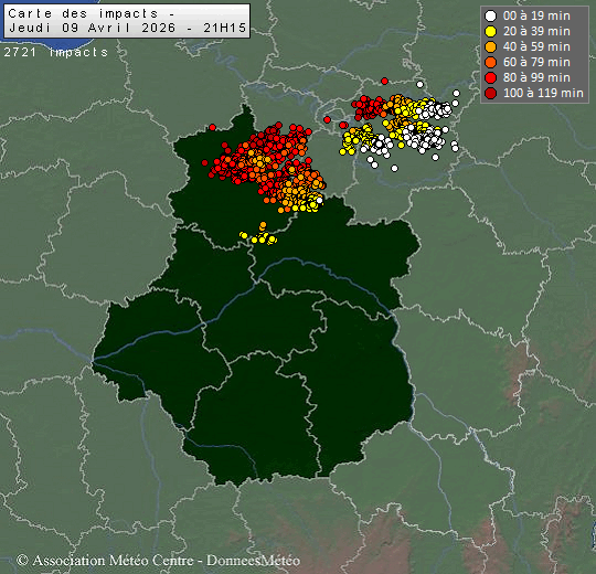 Ce jeudi après-midi, les températures sont restées estivales, le mercure a quasi partout dépassé le seuil de chaleur (25.0°C). Des orages ont également touché le nord de la région et tout particulièrement l'Eure-et-Loir. Quelques averses se sont développées dans le Vendômois et le Loiret.