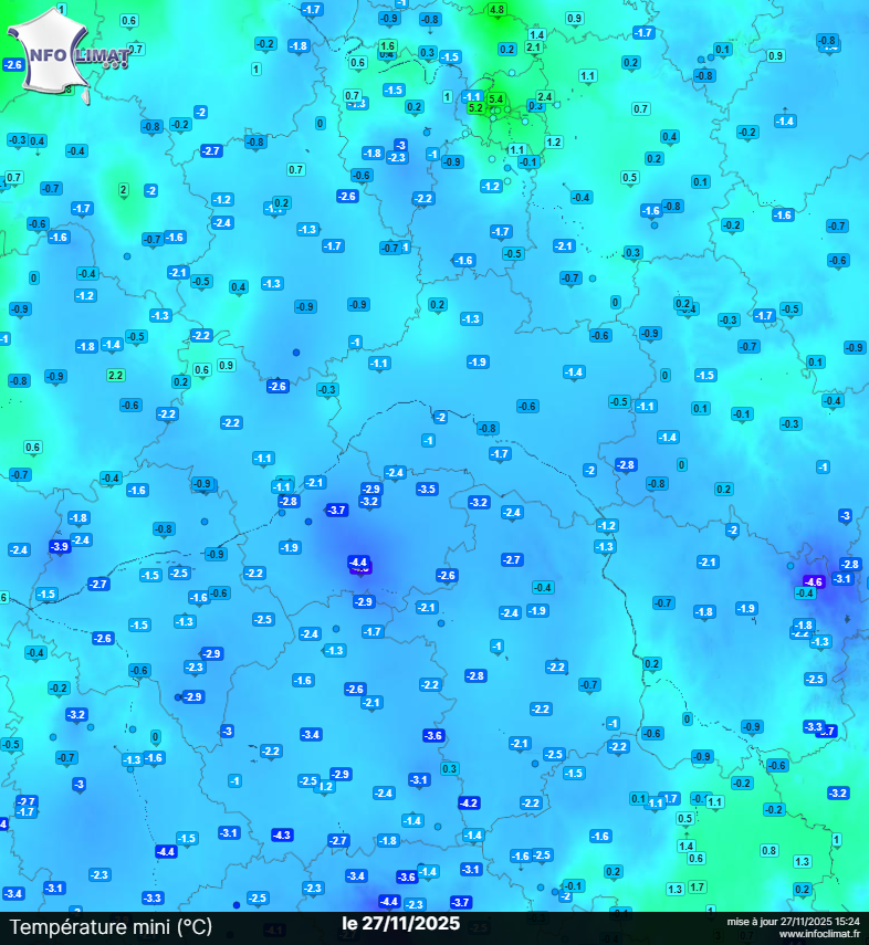 Carte des gelées du 27 novembre 2025 dans le Centre - Val de Loire