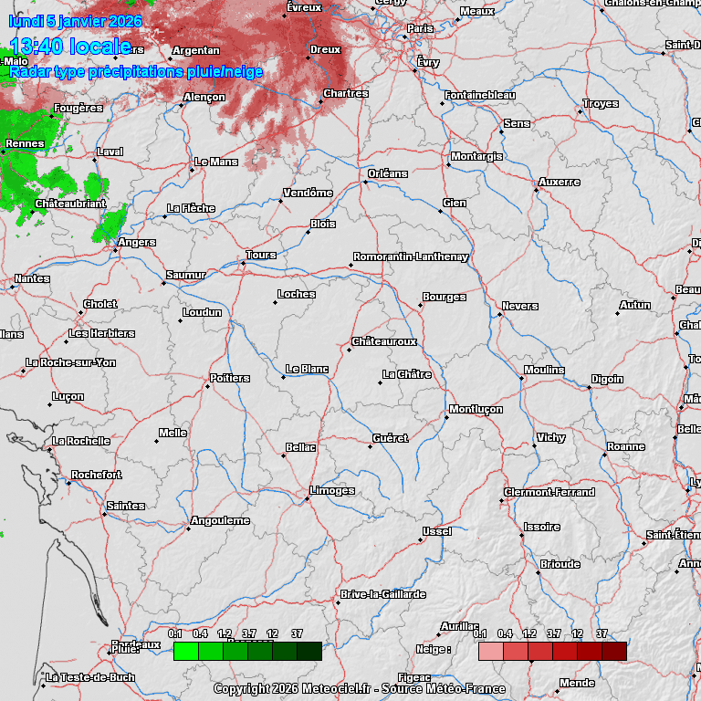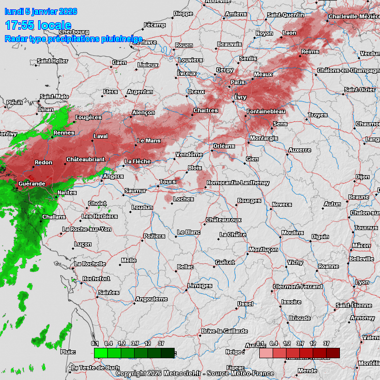 Evolution des précipitations pluvieuses et neigeuses au cours de l'après-midi du 5 janvier 2025 dans la région Centre - Val de Loire - Source: Météociel.fr