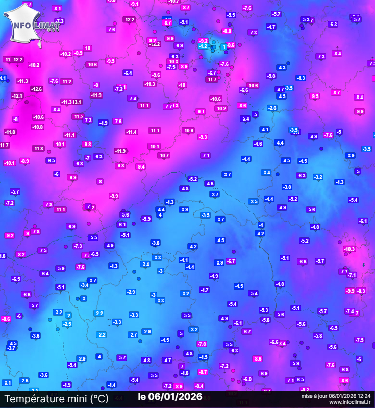 Comme nous pouvions nous y attendre, les températures ont chuté là où les sols sont enneigés ce matin. Des gelées fortes à très fortes concernent une large partie de l'Eure-et-Loir, l'ouest du Loir-et-Cher. Cela a aussi été le cas dans le nord-ouest du Loiret et les trois quarts de la Touraine.