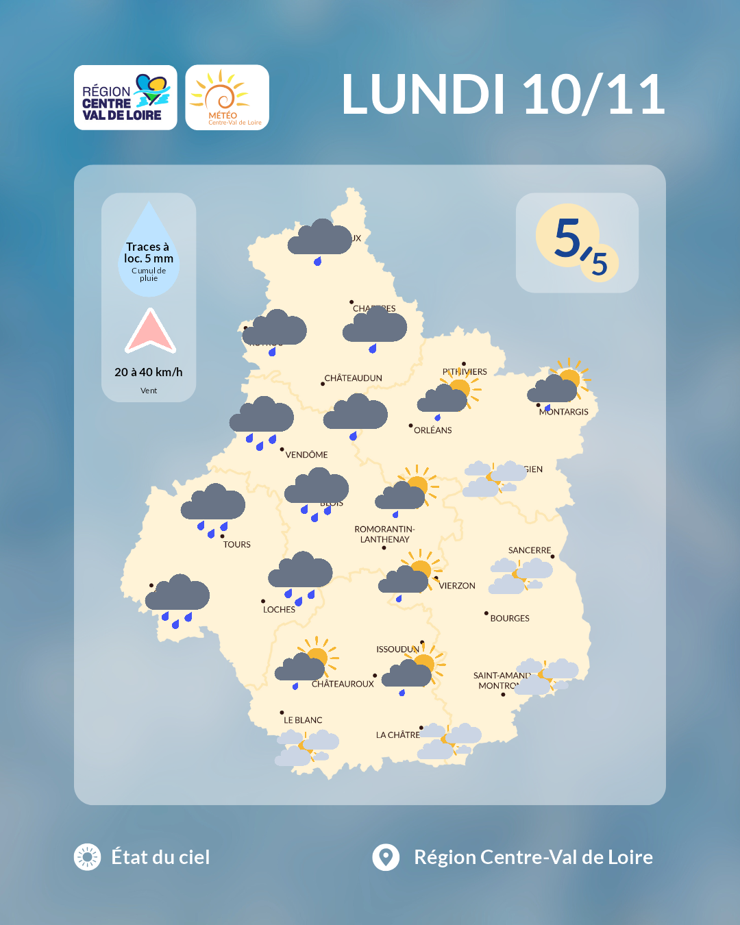 Tendance : Une perturbation océanique progresse lentement par l’ouest au fil de la journée. Elle apportera un temps maussade sur une grande partie de la région. Au matin, e ciel reste très nuageux à couvert sur l’ensemble du territoire. Quelques éclaircies résistent encore vers le Berry, tandis que des nuages plus denses s’installent déjà sur l’ouest. En cours d'après-midi, la perturbation gagne du terrain vers l’est. Les pluies deviennent faibles à localement modérées entre l’Indre-et-Loire et le Loir-et-Cher. À l’avant, sur l’Indre, le Cher et le Loiret, le ciel se couvre progressivement avec un risque d’ondées isolées. Quelques éclaircies subsistent encore temporairement sur l'est et le sud de la région. Vent de sud à sud-ouest, soufflant entre 20 et 40 km/h, plus sensible sur l’ouest de la région.