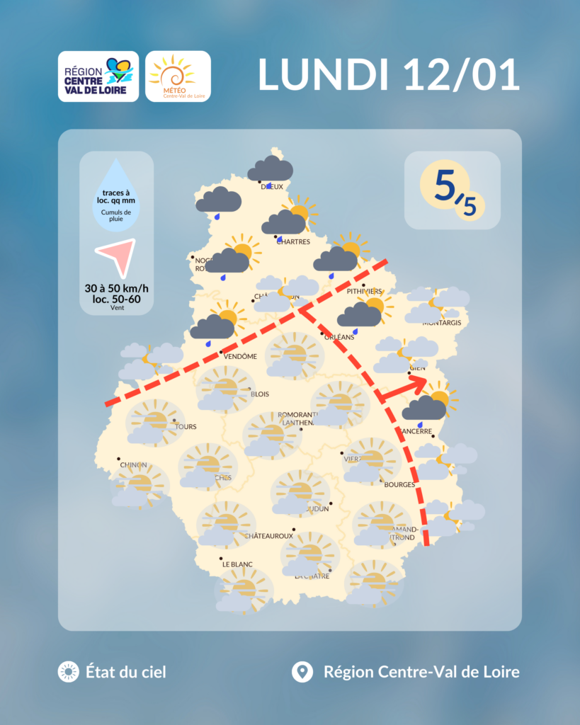 Etat du ciel en région Centre - Val de Loire prévu en début d'après-midi de ce lundi 12 janvier 2026 (copyright : Association Météo Centre - Val de Loire).
