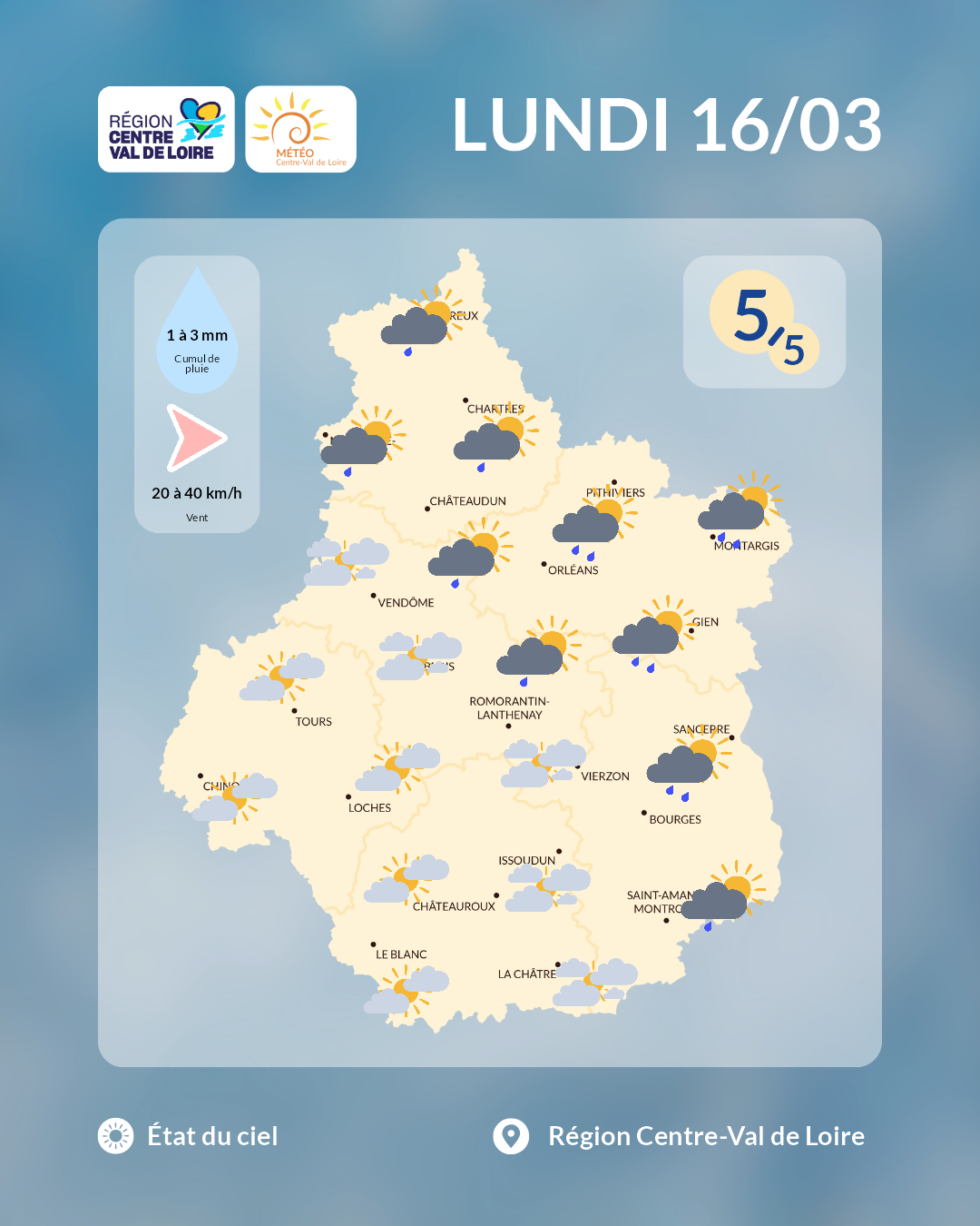 Etat du ciel en région Centre - Val de Loire prévu dans l'après-midi de ce lundi 16 mars 2026 (copyright : Association Météo Centre - Val de Loire).