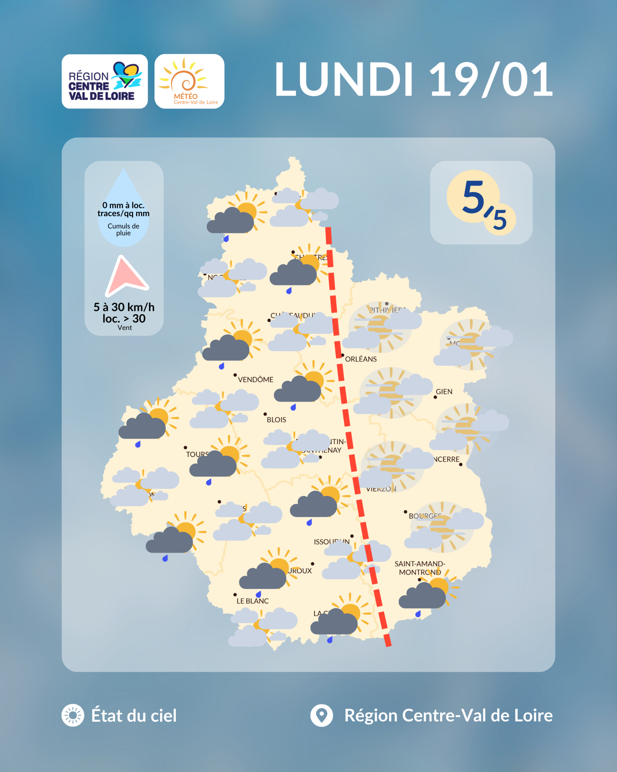 Etat du ciel en région Centre - Val de Loire prévu dans l'après-midi de ce lundi 19 janvier 2026 (copyright : Association Météo Centre - Val de Loire).