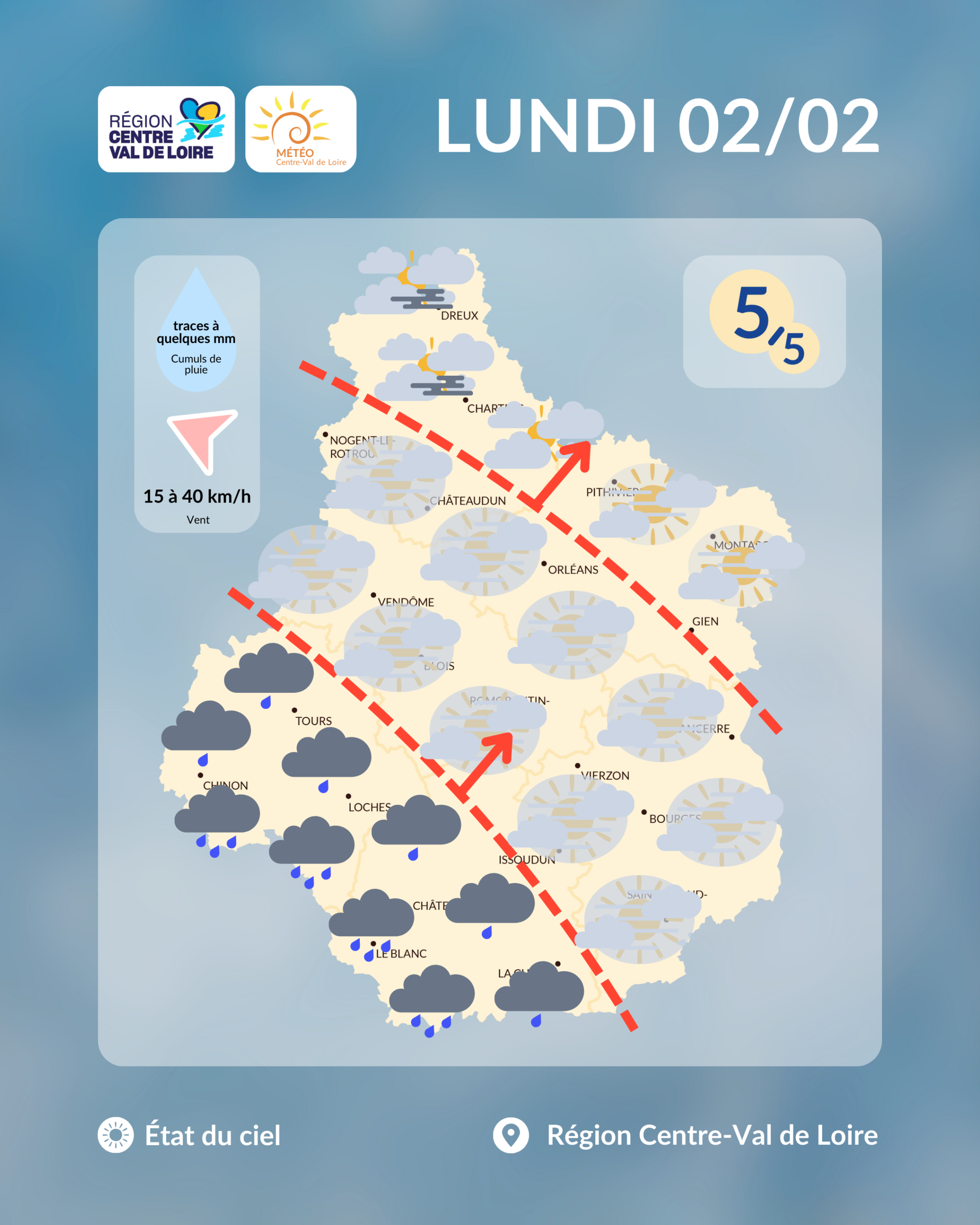 Etat du ciel en région Centre - Val de Loire prévu dans l'après-midi de ce lundi 2 février 2026 (copyright : Association Météo Centre - Val de Loire).