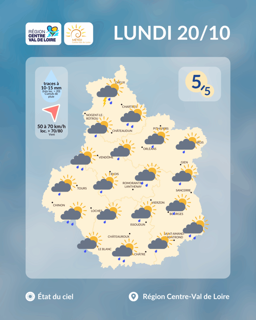 Vers une semaine du 20 au 26 octobre 2025 agitée sur le Centre - Val de Loire avec la mise en place d'un flux océanique perturbé (averses, pluie, vents parfois soutenus) !