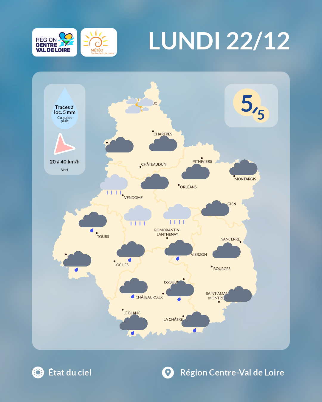 Etat du ciel en région Centre - Val de Loire prévu dans l'après-midi de ce lundi 22 décembre 2025 (copyright : Association Météo Centre - Val de Loire).