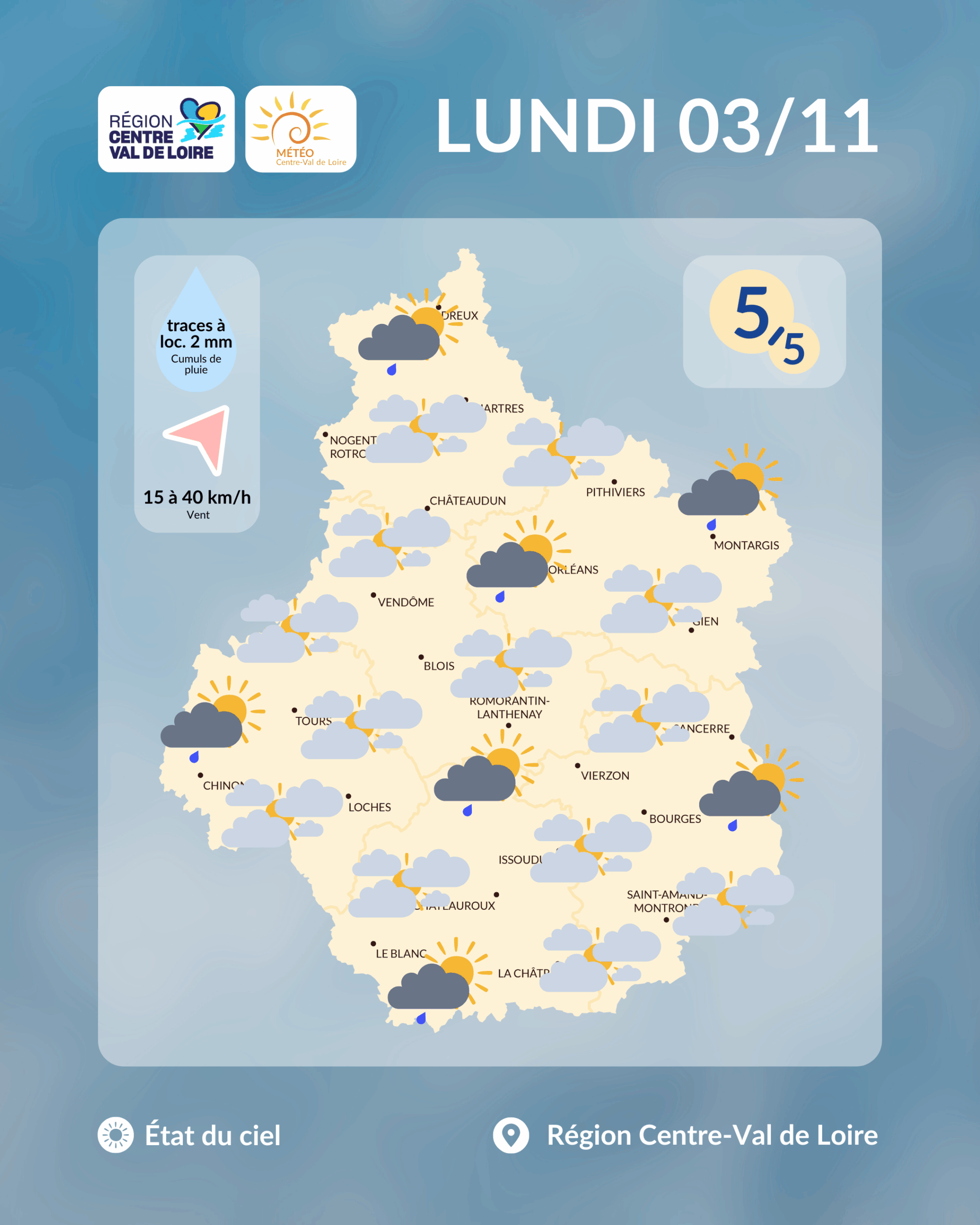 Etat du ciel en région Centre - Val de Loire prévu à la mi-journée de ce lundi 3 novembre 2025 (copyright : Association Météo Centre - Val de Loire).
