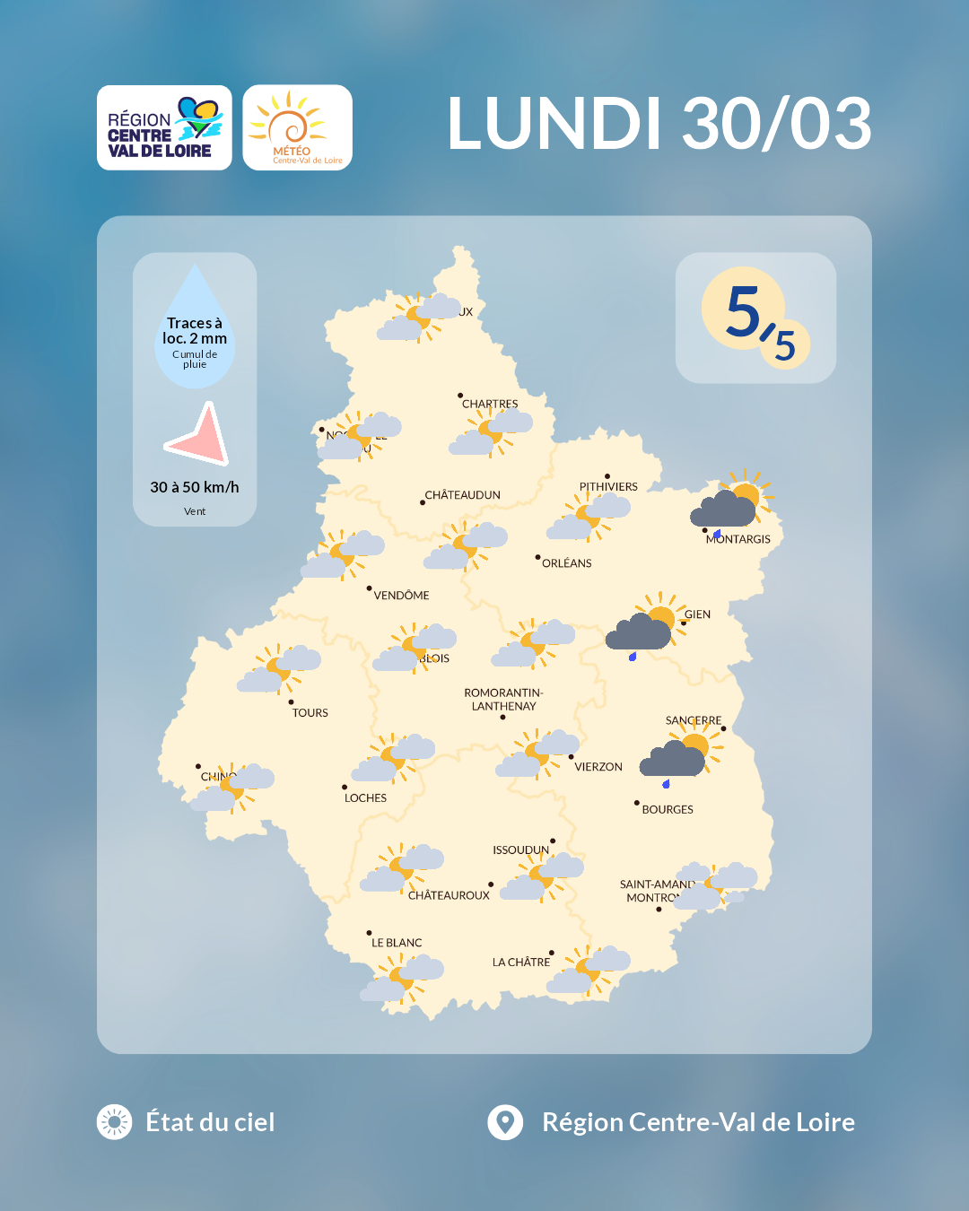 Etat du ciel en région Centre - Val de Loire prévu dans l'après-midi de ce lundi 30 mars 2026 (copyright : Association Météo Centre - Val de Loire).