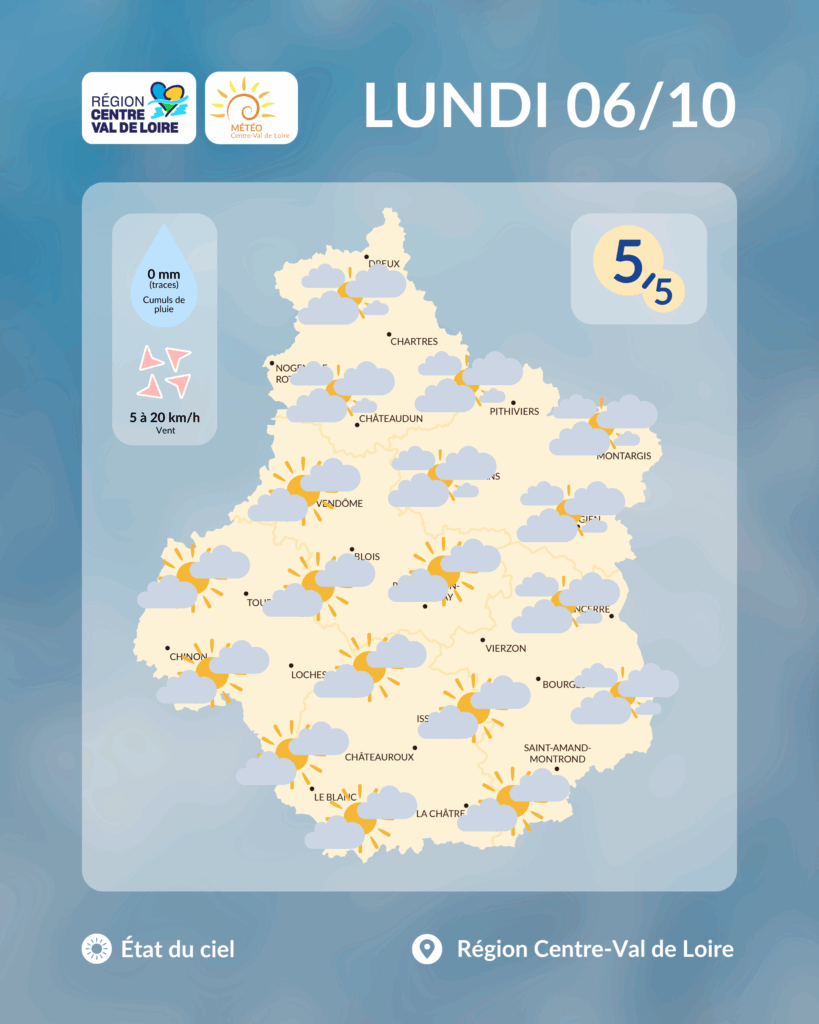 Etat du ciel en région Centre - Val de Loire prévu dans l'après-midi de ce lundi 6 octobre 2025 (copyright : Association Météo Centre - Val de Loire).