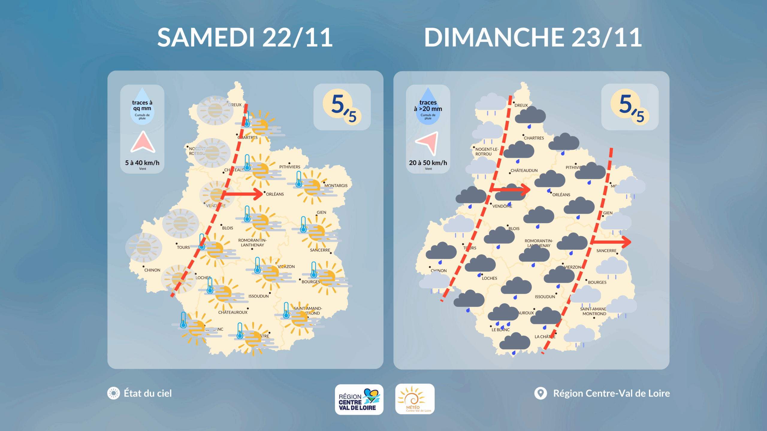 Etat du ciel en région Centre - Val de Loire prévu à la mi-journée de ce samedi 22 et ce dimanche 23 novembre 2025 (copyright : Association Météo Centre - Val de Loire).