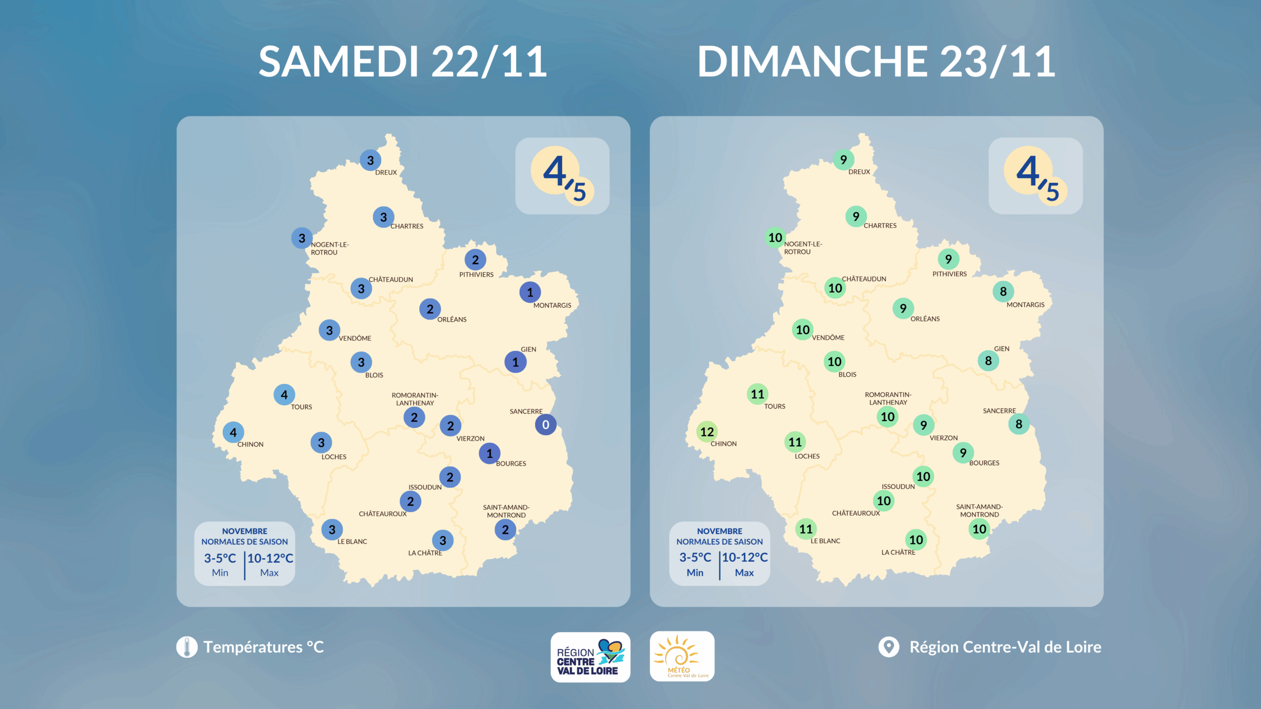Températures maximales en région Centre - Val de Loire prévues ce samedi 22 et ce dimanche 23 novembre 2025 (copyright : Association Météo Centre - Val de Loire).