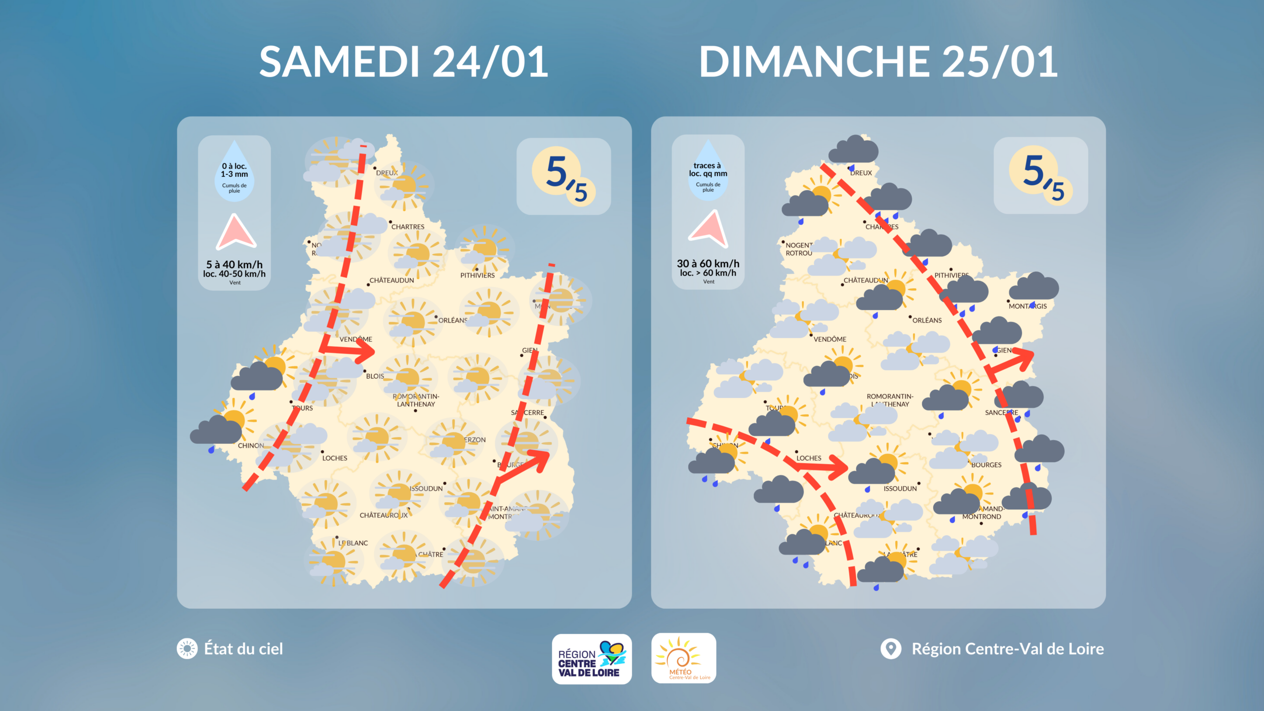 Etat du ciel en région Centre - Val de Loire prévu dans l'après-midi de ce samedi 24 et ce dimanche 25 janvier 2026 (copyright : Association Météo Centre - Val de Loire).
