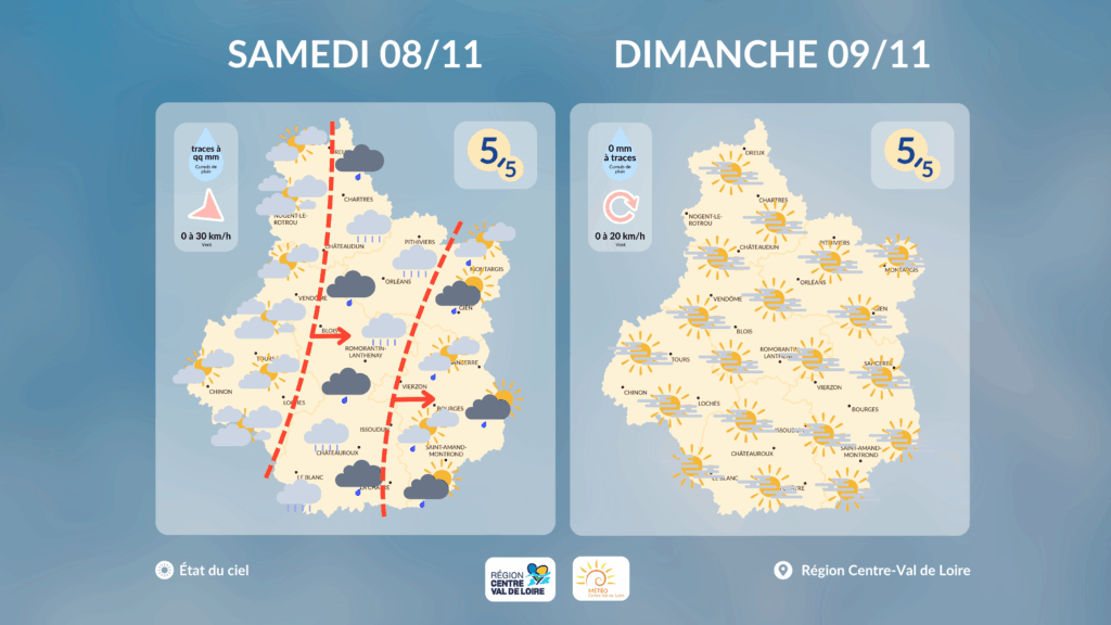 Vers un week-end du 8 et 9 novembre 2025 bien automnal sur le Centre - Val de Loire : restes d'un petit front pluvieux en fin de vie samedi, entre grisailles tenaces et éclaircies dimanche...