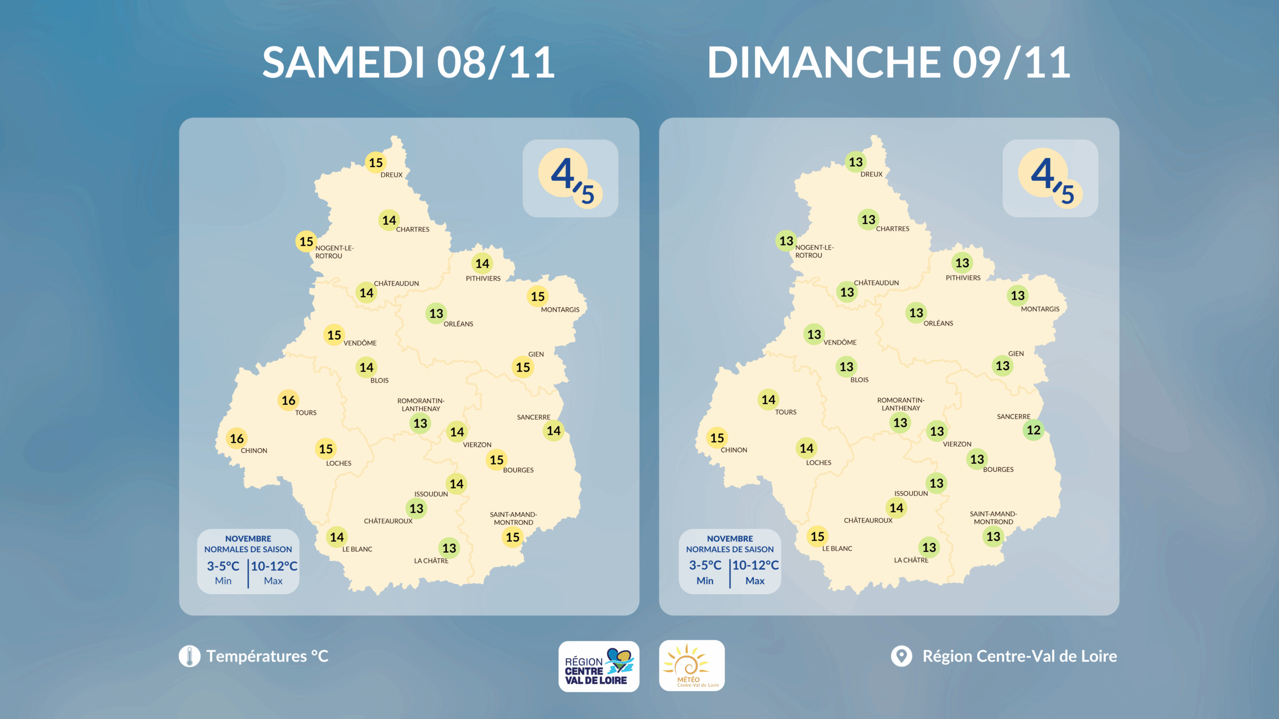 Températures maximales en région Centre - Val de Loire prévues ce samedi 8 et ce dimanche 9 novembre 2025 (copyright : Association Météo Centre - Val de Loire).
