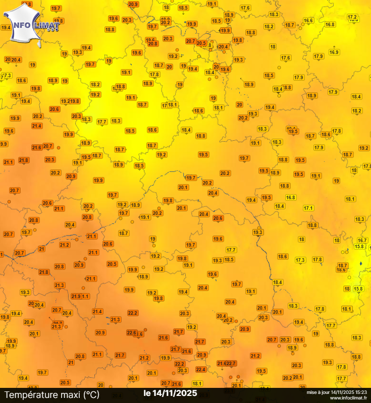 Les températures ont été une nouvelle fois bien trop pour une mi-novembre. On note encore de nombreuses stations avec 20°C ou plus en début d'après-midi. Les températures ont ensuite baissé grâce aux pluies et aux orages qui ont concerné notre région.