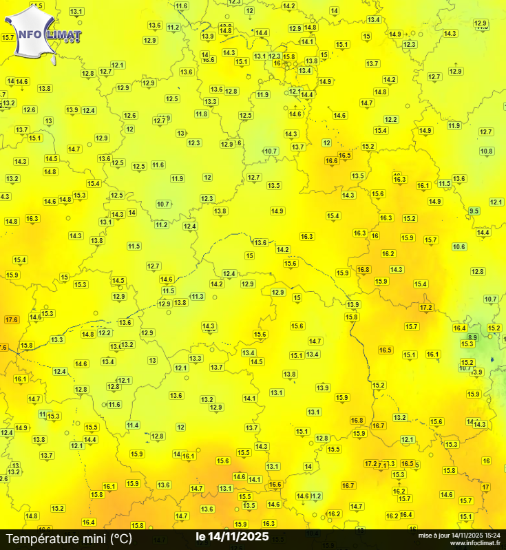 Retrouvez ci-dessous les températures minimales (>13.0°C) de notre réseau de stations (en bleu les stations Météo France).