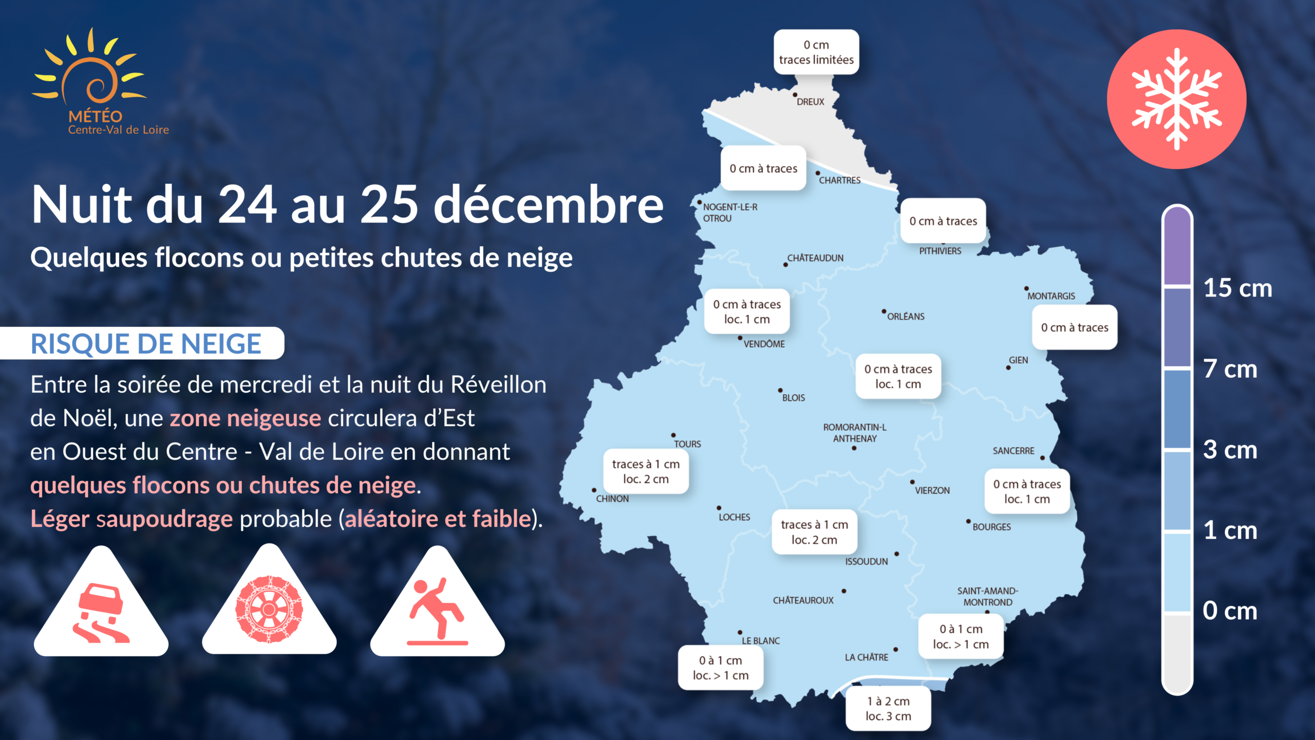 Carte risque neige de la nuit au 24 au 25 décembre 2025 (copyright : Association Météo Centre - Val de Loire). Cliquer sur l'image pour l'agrandir.