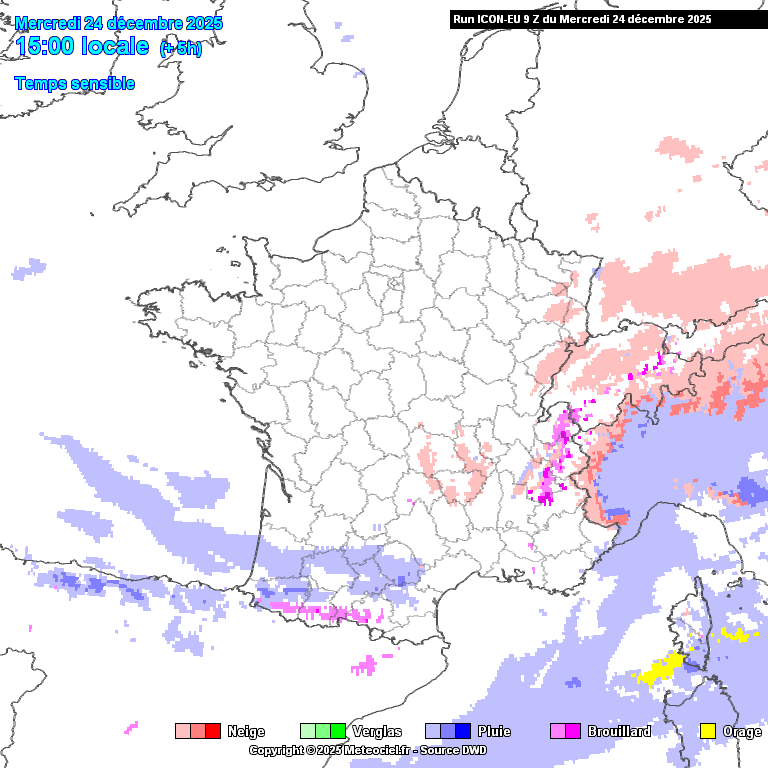 Animation : précipitations prévues entre ces 24 et 25 décembre 2025 par le modèle ICON-EU (copyright : Météociel).
