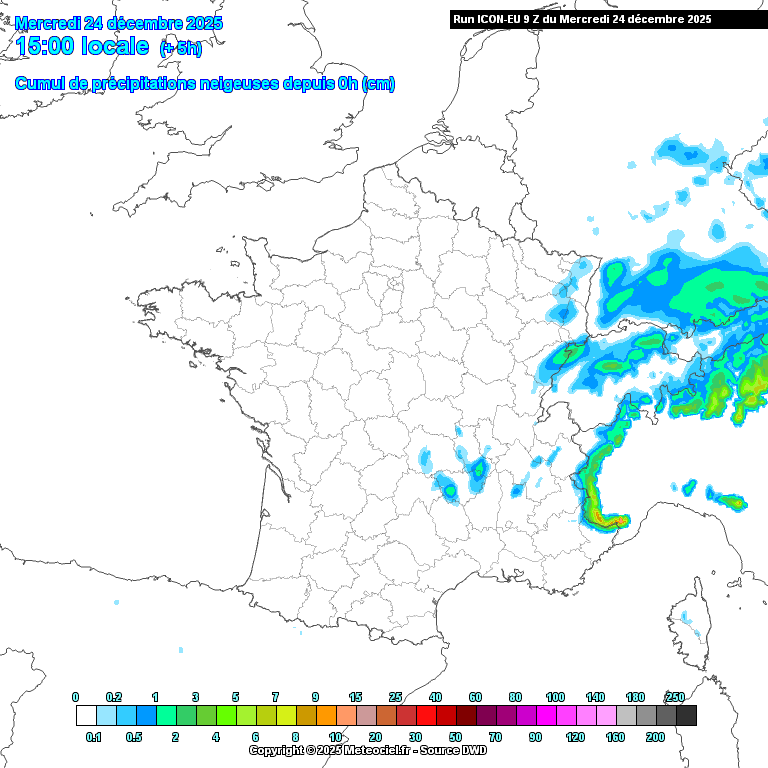 Animation : cumuls de neige prévus entre ces 24 et 25 décembre 2025 par le modèle ICON-EU (copyright : Météociel). Ne tiens pas en compte la potentielle fonte (animation montrant simplement le potentiel attendu).