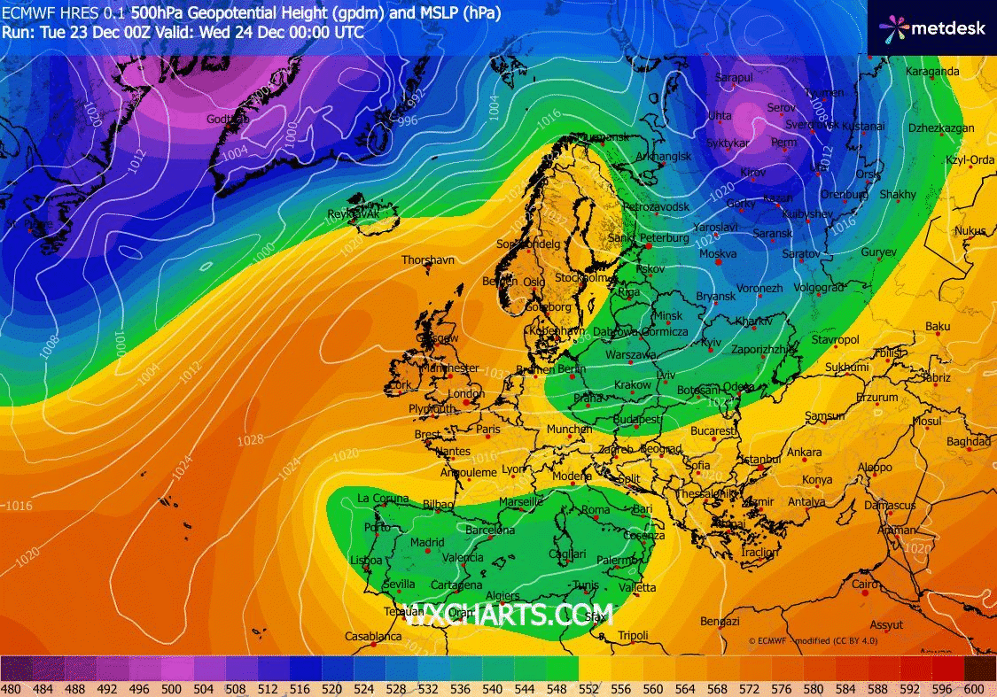 Animation : géopotentiels vers 5500m d'altitude et pressions au niveau de la mer prévus par le modèle ECMWF, entre les 24 et 26 décembre 2025 (copyright : WxCharts).