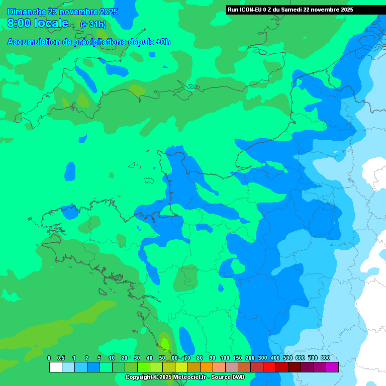 Animation : cumuls prévus entre ces 22 et 23 novembre 2025 par le modèle ICON-EU (copyright : meteociel.fr).