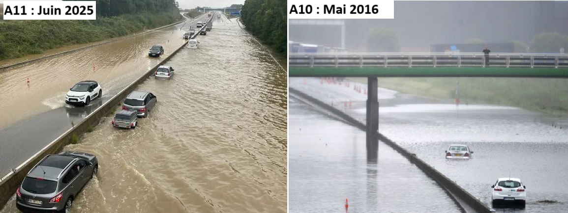 Inondations sur les autoroutes A11 (à gauche) et A10 (à droite).