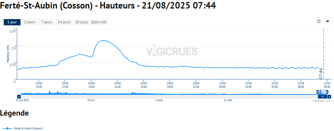Hauteur du Cosson à La Ferté-St-Aubin (45) le 21 août 2025 - Vigicrue.gouv.fr
