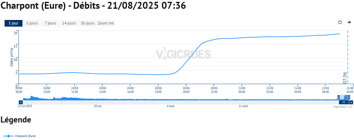 Débit de l'Eure à Charpont le 21 août 2025 - Vigicrue.gouv.fr