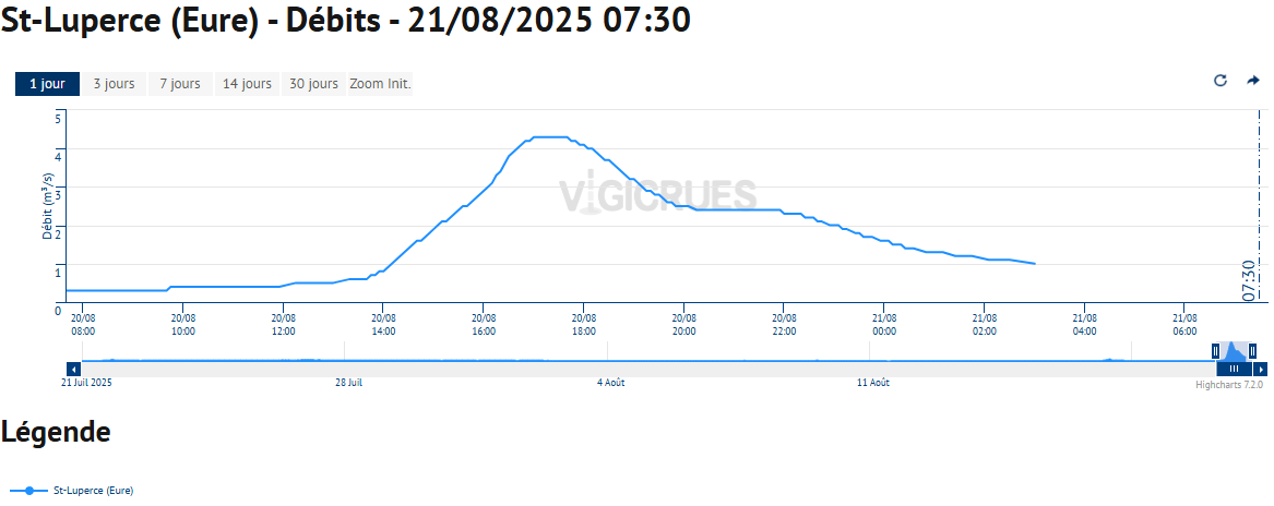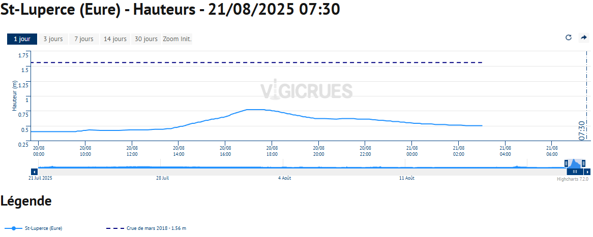 Hauteur de l'Eure à Saint-Luperce le 21 août 2025 - Vigicrue.gouv.fr