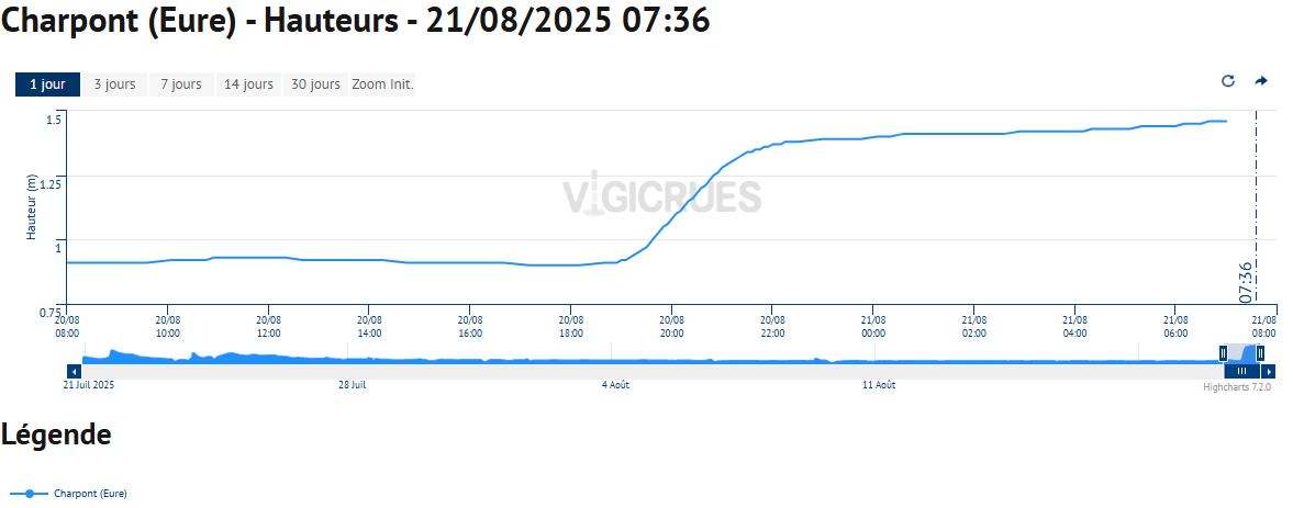 Hauteur de l'Eure à Charpont le 21 août 2025 - Vigicrue.gouv.fr