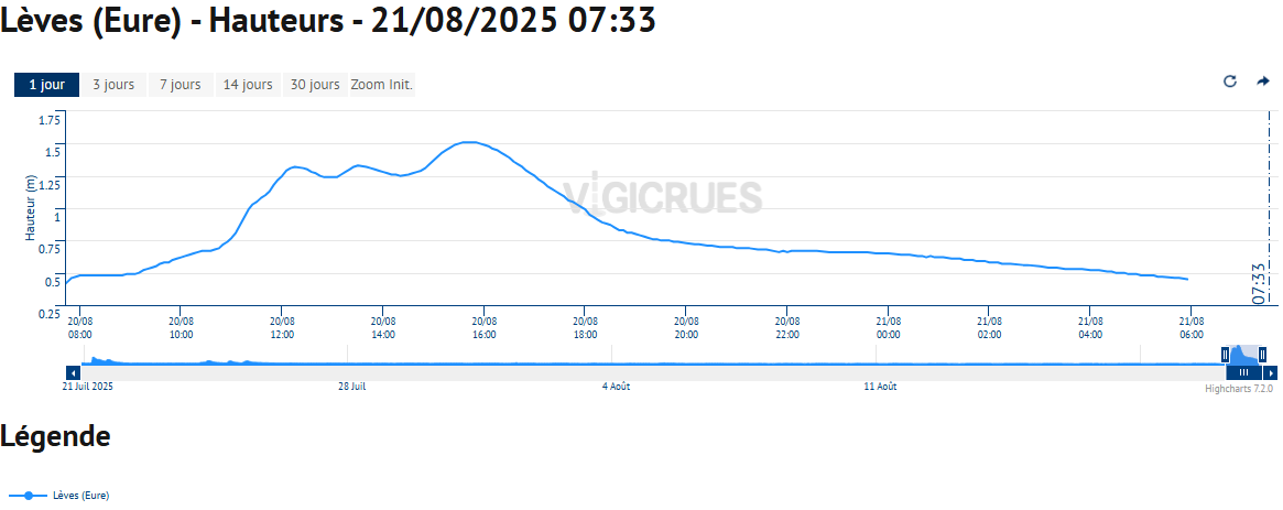 Hauteur de l'Eure à Lèves le 21 août 2025 - Vigicrue.gouv.fr