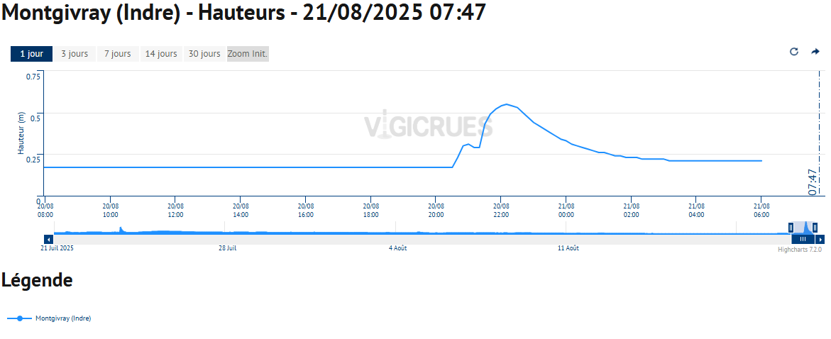 Hauteur de l'Indre à Montgivray (36) le 21 août 2025 - Vigicrue.gouv.fr