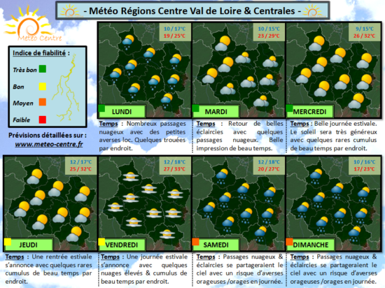 Vers une semaine de la Rentrée estivale : après un lundi plutôt mitigé avec de nombreux passages nuageux et quelques gouttes, un temps ensoleillé et chaud s'annonce de mardi à vendredi. Un temps instable pourrait se mettre en place pour notre weekend mais la fiabilité reste limitée. Les choses sont susceptibles d'évoluer d'ici vendredi. A suivre...